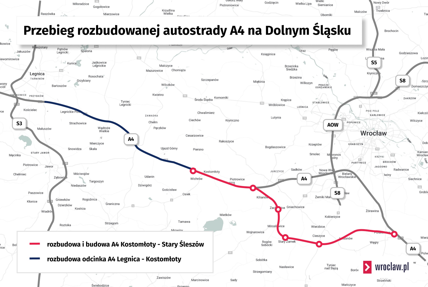 Prognozy ruchu dla aglomeracji wrocławskiej nie pozostawiają złudzeń – dotychczasowe rozwiązania wyczerpały swoją wydolność. Obecnie trasa musi obsłużyć ponad 60 tysięcy pojazdów na dobę, co sprawia, że dobudowa trzeciego pasa w starym śladzie byłaby jedynie półśrodkiem. Dzięki nowemu rozwiązaniu, w rejonie Wrocławia kierowcy będą mieli do dyspozycji łącznie aż dziesięć pasów ruchu. Zostanie wybudowany nowy ślad A4 omijający Wrocław. Odcinek autostrady od Legnicy w kierunku zachodnim zostanie rozbudowany w starym śladzie poprzez dobudowę trzeciego pasa.