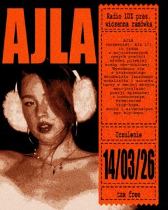 𝗔𝗝𝗟𝗔 – obficie grana na 91.6 FM od czasu wydania Ala17 EP. Zawieszona pomiędzy jazzem i hip-hopowym podziemiem, współpracowała m.in. z ĆPAJ STAJLEM, Zdechłym Osą, muzykami z formacji Omasta i producentem 2K88. W trakcie koncertu zaprezentuje to, czym ujęła już pół Polski – miękki głos i subtelne teksty, odczarowując polską scenę R&B. Będzie bardzo wyjątkowo, bo zagra u nas tydzień po wydaniu debiutanckiego albumu (Dyspensa Rec.)