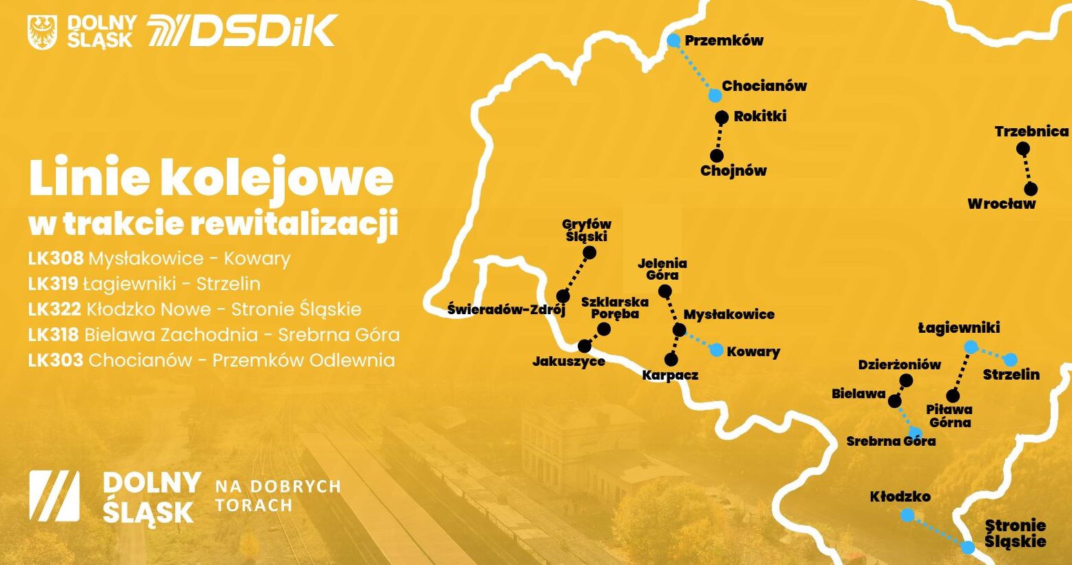 Program obejmuje rewitalizację linii, które przez lata były nieczynne. Obecnie prace trwają jednocześnie na pięciu odcinkach, w tym na trasie w stronę Srebrnej Góry.