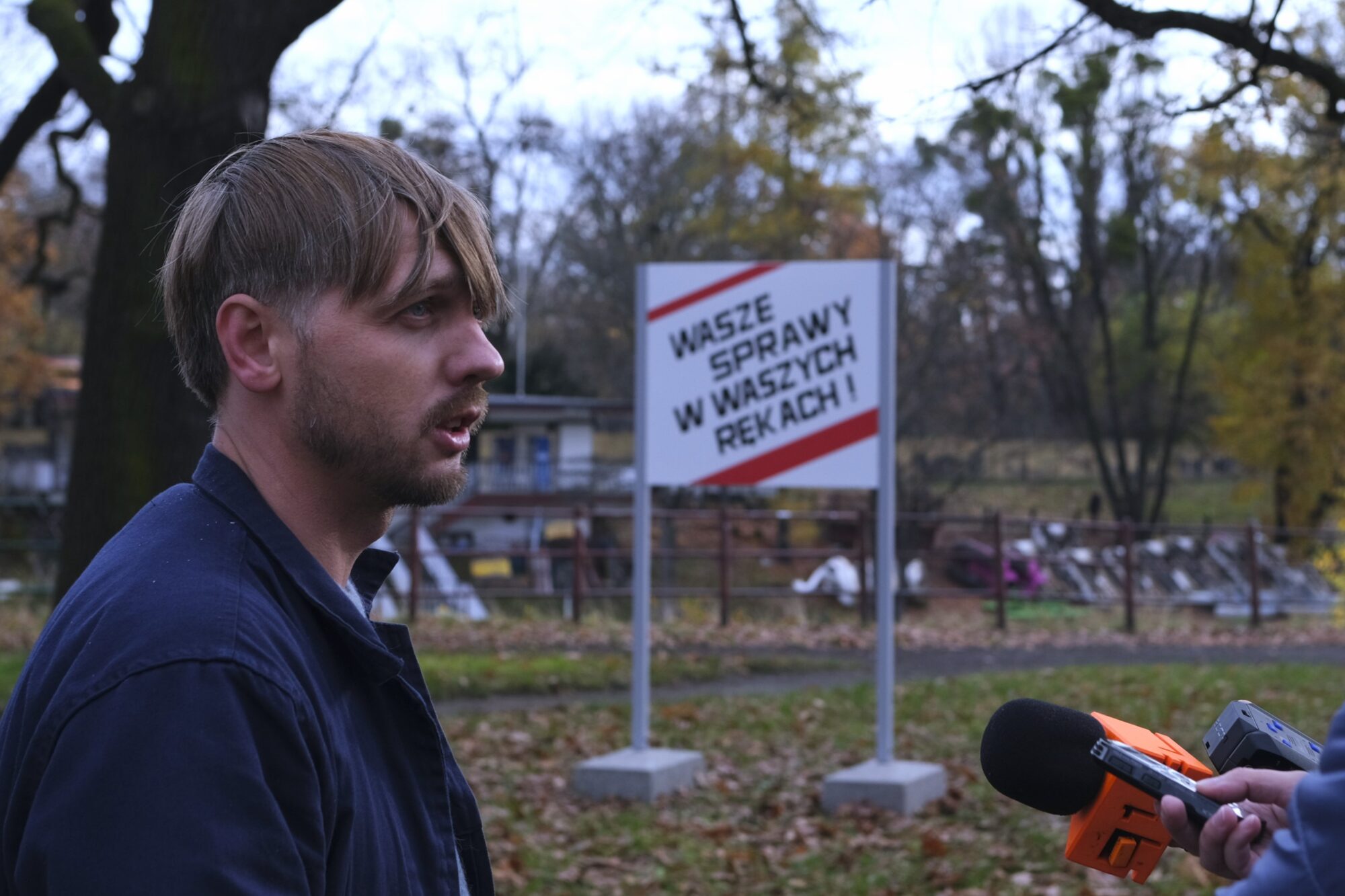 „To są niemieckie szczeliny przeciwlotnicze, które zostały zasypane w latach 80-tych. Są pozostałościami po II wojnie światowej. Odmalowałem na nich 30-centymetrowe linie ewakuacyjne. Były na wysokości wzroku. Jeżeli w nocy byłby blackout, te linie będą się świecić na zielono, tak jak znaki ewakuacyjne. Pomiędzy szczelinami stoją dwie rzeźby z mojej serii kolażów. Czasami robię z nich rzeźby. »Wartość tych słów zależy również od ciebie« to projekt, w którym pracuję z archiwami, ze zdjęciami archiwalnymi z Muzeum Tatrzańskiego. Są to zdjęcia archiwalne Władysława Hasiora, który jeździł w latach 70-tych po Polsce i dokumentował propagandę. On to nazwał poezją przydrożną. Ja pracuję z tą dokumentacją, z tą propagandą tak, że tak naprawdę robię swoją propagandę. Wymieniam niektóre słowa, uwspółcześniam, wprowadzam feminatywy, delikatnie zmieniam. Zgadzam się z Hasiorem, że jest to rodzaj poezji, z którą bardzo łatwo pracować. Niestety propaganda jest tak podatna, że można ją bardzo łatwo wykorzystywać na swój sposób. Ale robiąc to, zastanawiam się nad tym, jak wyglądałaby dzisiaj Polska, jeżeli ta propaganda w latach 70-tych byłaby taka, jaką ja proponuję. Tutaj w oryginale na tym szyldzie w latach 70-tych pisało »nasze sprawy w naszych rękach«. Ja zmieniłem na »wasze sprawy w waszych rękach«, bo z pozycji tego, że jestem tu gościem, imigrantem, chciałem powiedzieć, że wasze sprawy w waszych rękach. I te wasze sprawy dotyczą bezpieczeństwa i schronów.”