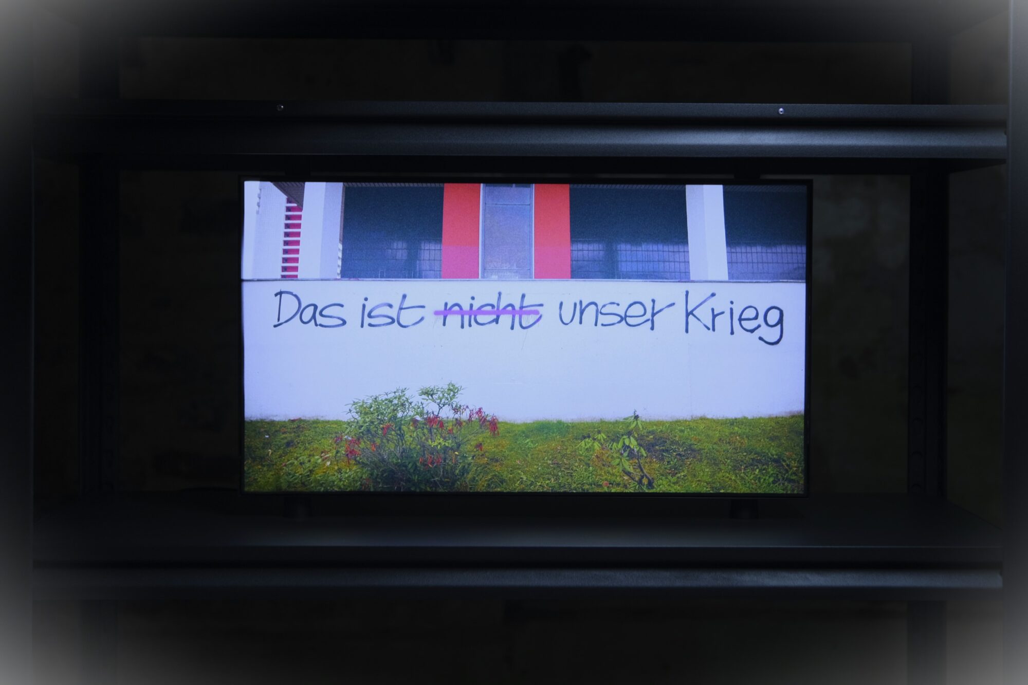 „Jest to napis, który w 2022 roku sporadycznie i masowo, masowo, można powiedzieć, pojawiał się w Berlinie. Kilka miesięcy po wybuchu wojny w Ukrainie pojawiały się napisy »to nie nasza wojna«. Zaingerowałem. To było na budynku, w którym ja mam pracownię, w Berlinie, w dzielnicy Lichtenberg. Zrobiłem bardzo prosty gest – zakreśliłem słowo »nie«. I wyszło »to nasza wojna«.”